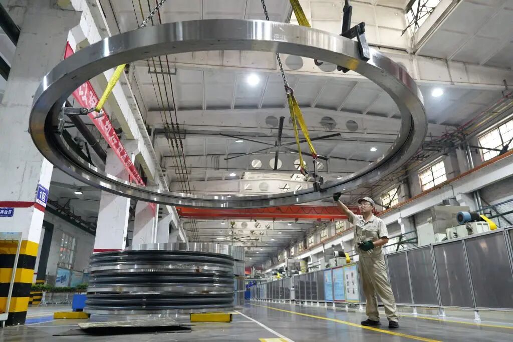 2025年5月22日,工人在洛陽軸承集團股份有限公司風電三車間生產線上作業。新華社記者 李嘉南 攝