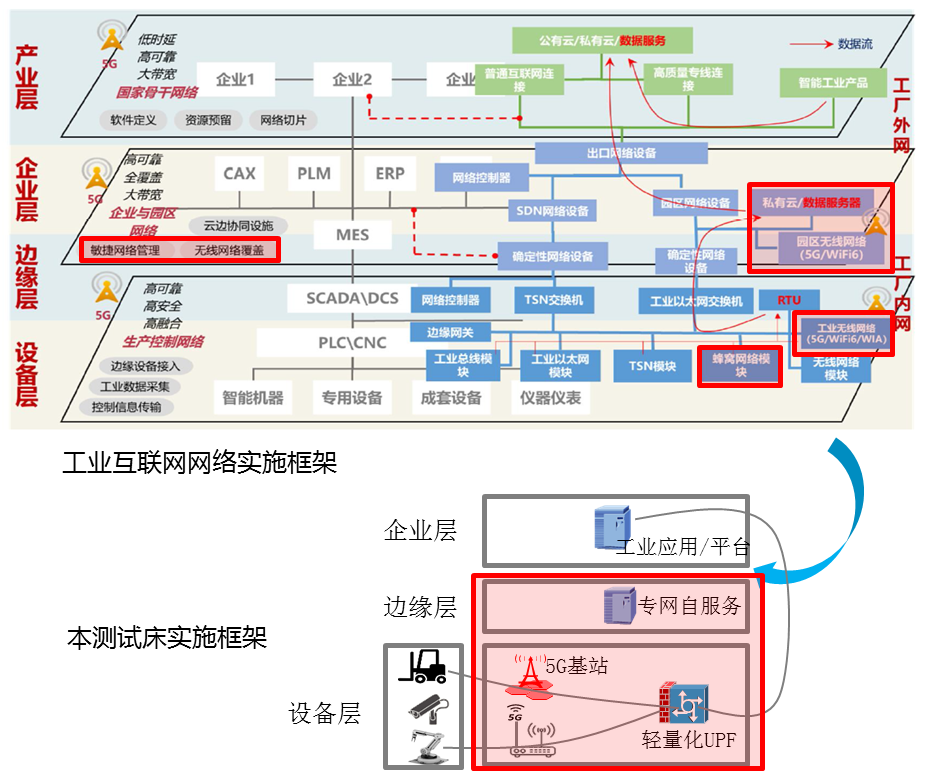 在工業互聯網網絡實時框架中,本測試床內容包含設備層的工業終端(5G蜂窩網絡模塊)、邊緣和企業層的5G無線網絡、本地邊緣計算(私有云)如下所示: