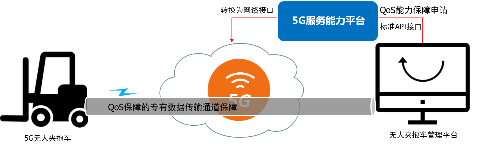 作業時用有保障的可靠連接:無人夾抱車平臺需要叉車進行作業時,發起網絡能力調用指令,通知網絡夾抱車即將作業。