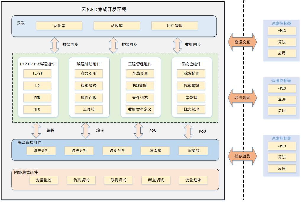 云化PLC集成開發(fā)環(huán)境以核心功能模塊為單元進行圖形界面和業(yè)務數(shù)據(jù)的模塊化組件設(shè)計開發(fā),高內(nèi)聚低耦合功能模塊單元構(gòu)建了可靠性高、拓展性強的云化PLC集成開發(fā)環(huán)境。