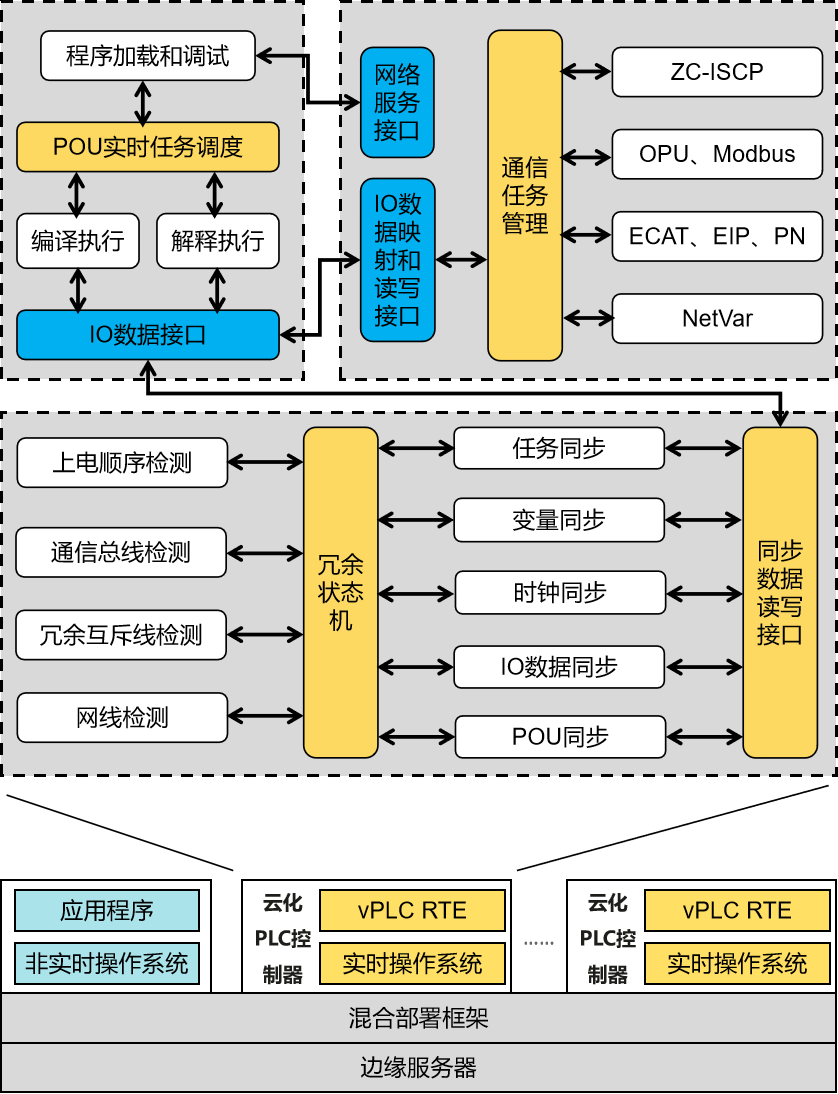 基于混合部署框架,單個或者多個云化PLC控制器部署在同一邊緣服務器,其關(guān)鍵技術(shù)包括POU實時任務調(diào)度、多協(xié)議通信管理和熱備冗余。