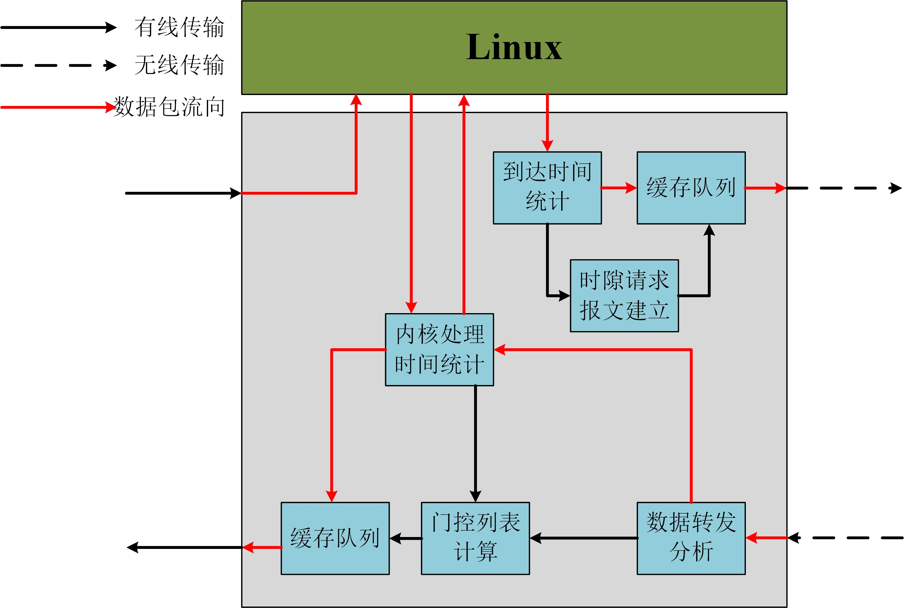 面向PLC云化部署的TSN交換機開發(fā):在工業(yè)互聯(lián)網(wǎng)領(lǐng)域中,業(yè)務流量模型相比傳統(tǒng)工業(yè)控制網(wǎng)絡(luò)的流量更為復雜,即從單一的產(chǎn)線內(nèi)部的控制流量,轉(zhuǎn)變?yōu)楫a(chǎn)線內(nèi)部、產(chǎn)線之間、控制網(wǎng)絡(luò)與信息網(wǎng)絡(luò)之間的多種業(yè)務流量類型并存。有線無線融合傳輸節(jié)點需要完成不同鏈路類型之間的數(shù)據(jù)轉(zhuǎn)換,模塊中的數(shù)據(jù)流向與子模塊功能如下圖所示。數(shù)據(jù)需要通過有線無線融合鏈路進行傳輸,數(shù)據(jù)在有線鏈路傳輸至無線輸出端口時,各節(jié)點的無線數(shù)據(jù)發(fā)送時刻由時隙分配算法的計算結(jié)果所決定。在每個有線無線融合傳輸節(jié)點中的重要模塊有:數(shù)據(jù)轉(zhuǎn)發(fā)分析模塊、門控列表計算模塊。通過通用硬件平臺和