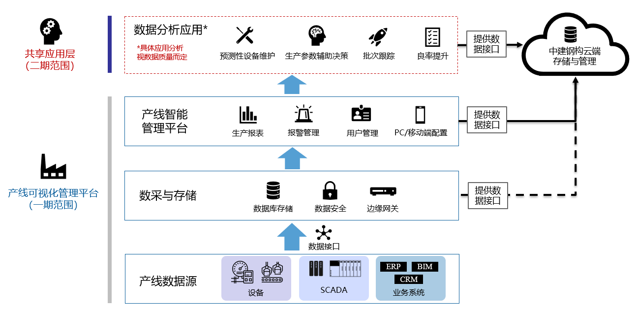 作為鋼結構行業工業互聯網的切入點,我們希望通過本次基于智能產線上的試點項目,以降本增效為目的,為生產、商務、財務等相關的業務部門提供實際的決策支撐作用。上層系統中的業務管理數據相打通,實現業務系統和生產系統聯動,達到產線級的IT/ OT系統融合。并且通過多種形式的展示,完成對產線數據的可視化呈現,以及圍繞成本這一重要維度的大數據分析應用,推動成本與工藝優化從而實現降本增效的目的。