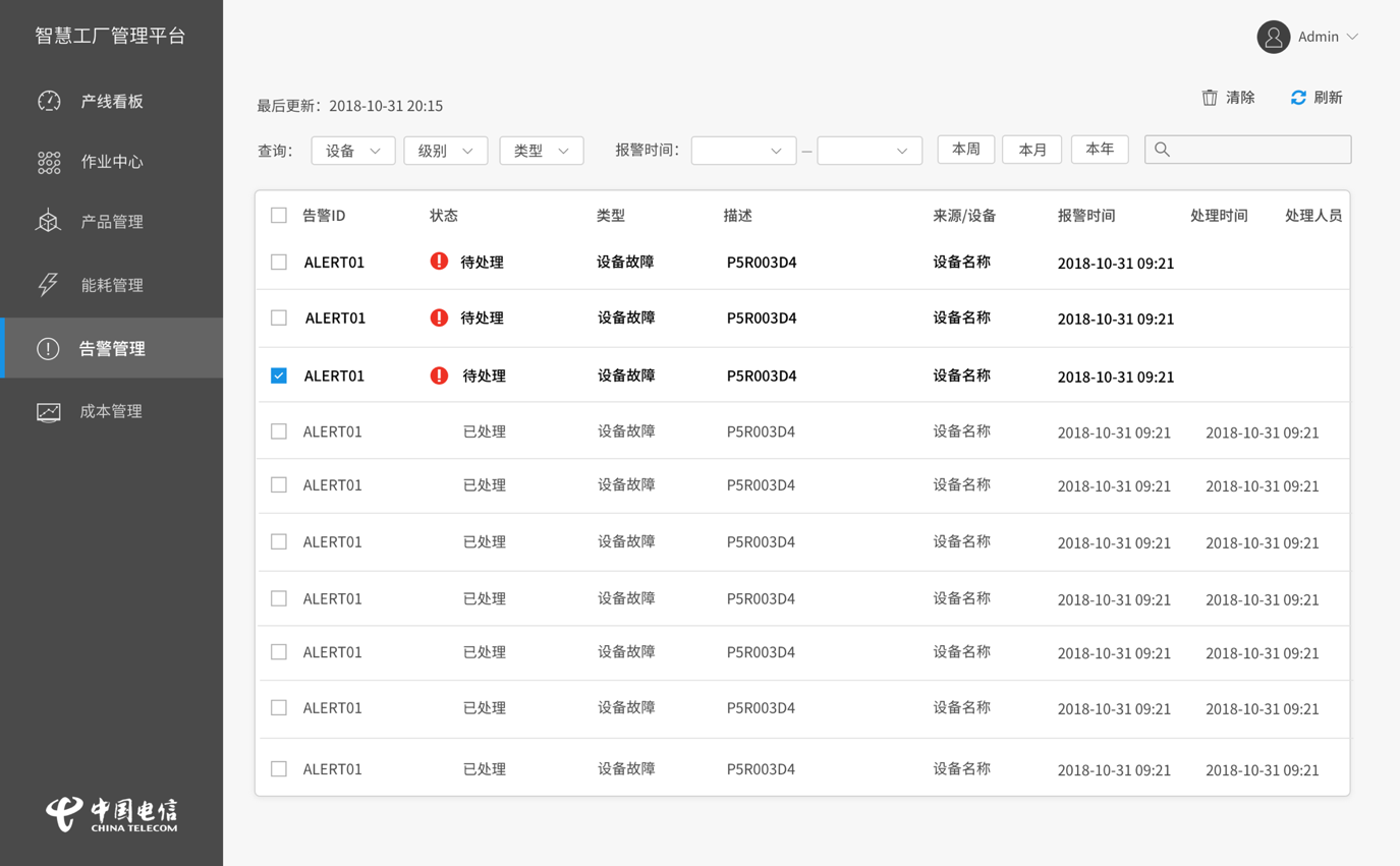 告警功能信息展示,將提供設備異常告警信息的高亮顯示,通過顯示告警詳情故障代碼,提示相應操作員和運維人員進行及時處理和維保服務,并在處理報警信息時記錄處理時間供后續進行歷史信息檢索。對歷史告警信息的檢索頁可以通過設備、時間等多個維度進行。主要內容包含: