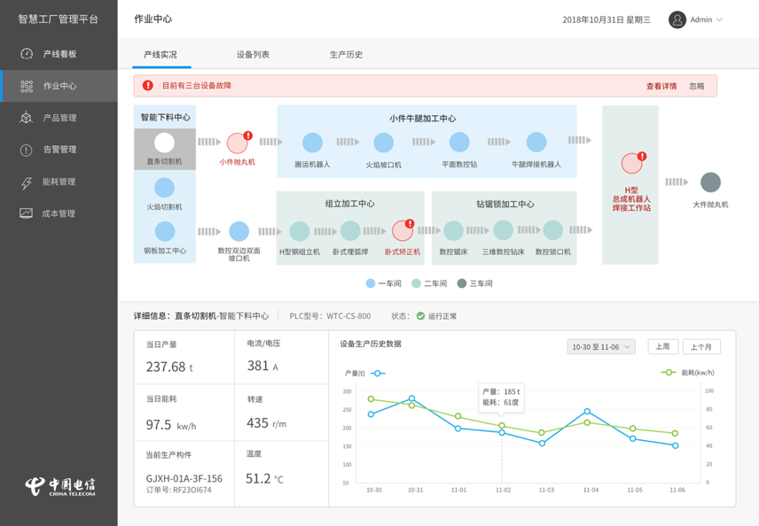 作業中心信息展示,是整體可視化平臺以設備管理為維度的功能下鉆。作業中心模塊分為產線實況、設備列表和生產歷史三大展示功能。產線實況可以查看產線總體的生產情況,并可以下鉆到加工中心或設備維度查看實時產量、生產參數和能耗情況。主要內容包含: