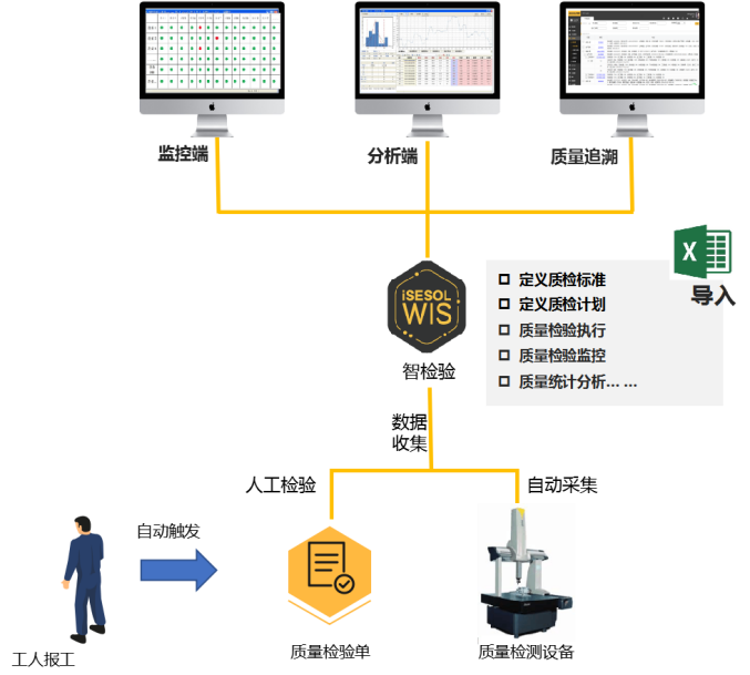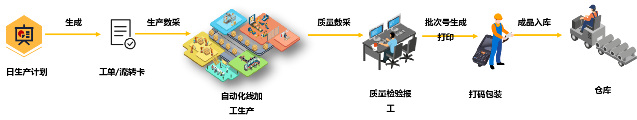 3)以電子工單或流轉卡為載體,進行生產數據和設備數據的自動采集,實現生產過程中人員、設備、質量、產品等信息相關聯,生產過程可視化,過程可追溯,實時掌握生產進度、料耗情況和品質控制等。