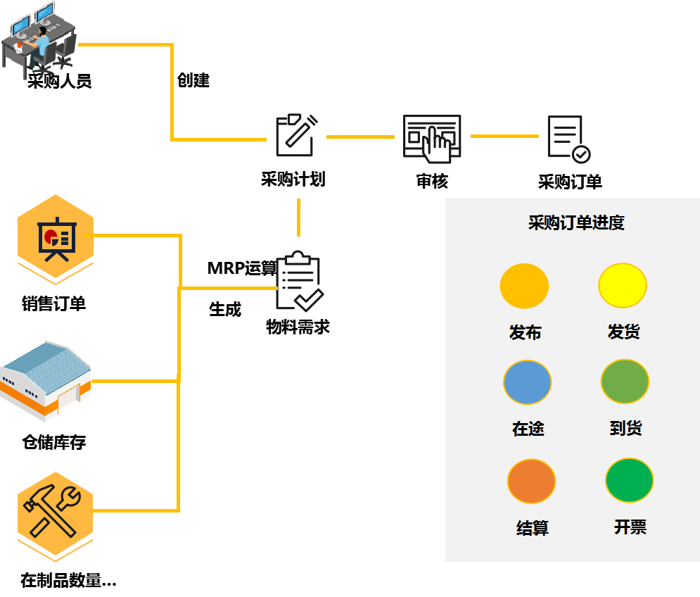 通過WIS系統提供的采購管理功能,根據銷售訂單、產品配方、銷售訂單、物料庫存等相關數據,系統能夠自動進行物料齊套檢查,自動生成物料需求計劃,采購人員可根據物料需求計劃,創建采購計劃。同時支持采購計劃的審核,物料采購進度狀態(發布、發貨、在途、到貨、結算、開票)的更新。各部門可通過系統,實時掌握物料采購進度,及時應對生產物料需求情況。