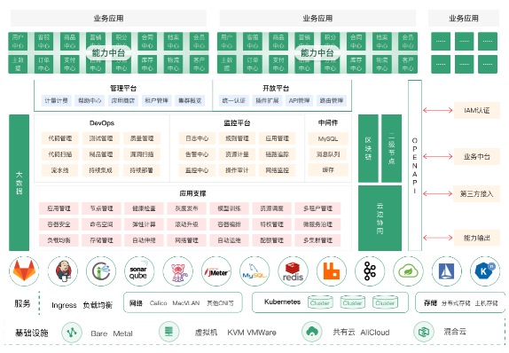 PaaS平臺對底層基礎設施和數據中心不敏感,可以平滑納管物理機、私有云、公有云等多種異構基礎設施,同時可以支撐多數據中心并將應用負載進行有效平衡,也可以有效保障數據在多分區的安全隔離和相互備份。采用先進的容器和大規模集群管理技術構建容器云平臺,借助容器的輕量級、標準化和彈性資源供給等能力,將工業應用進行標準化封裝并有效的自動化管理,提升應用的上云速度和能力。