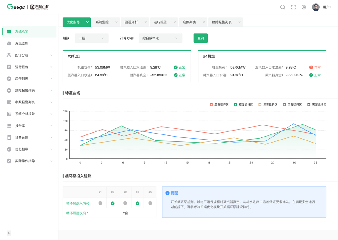 提供風機、空壓機、循環水等通用動力設備管理。風機優化通過建立布袋、煙道入口、煙道出口、風機、脫硫塔的設備模型,對參數實時監控,自動優化風機的開啟臺數、運行頻率,達到運行效率最大化。空壓機優化涵蓋供需平衡、空壓機設備效率提升兩部分:供需平衡通過IIOT平臺實時采集空壓機出口、用能端入口(電解槽、陽極車間、打料罐)、壓縮空氣管路的壓力、流量信息,結合算法模型,輸出推薦的壓縮空氣供氣壓力;設備效率提升是建立空壓機、干燥機設備模型,在給定壓縮空氣需求下,合理分配設備開關、設備頻率,以達成以最少的電耗滿足用氣需求。循環水系統是用于現場設備、產品降溫的系統,主要由換熱器、管道、循環泵組成。循環水優化通過監控用能端的實時溫度與流量信息,結合工藝要求和計量模型優化,實現循環泵的開關與頻率調整,反饋到制冷機設
