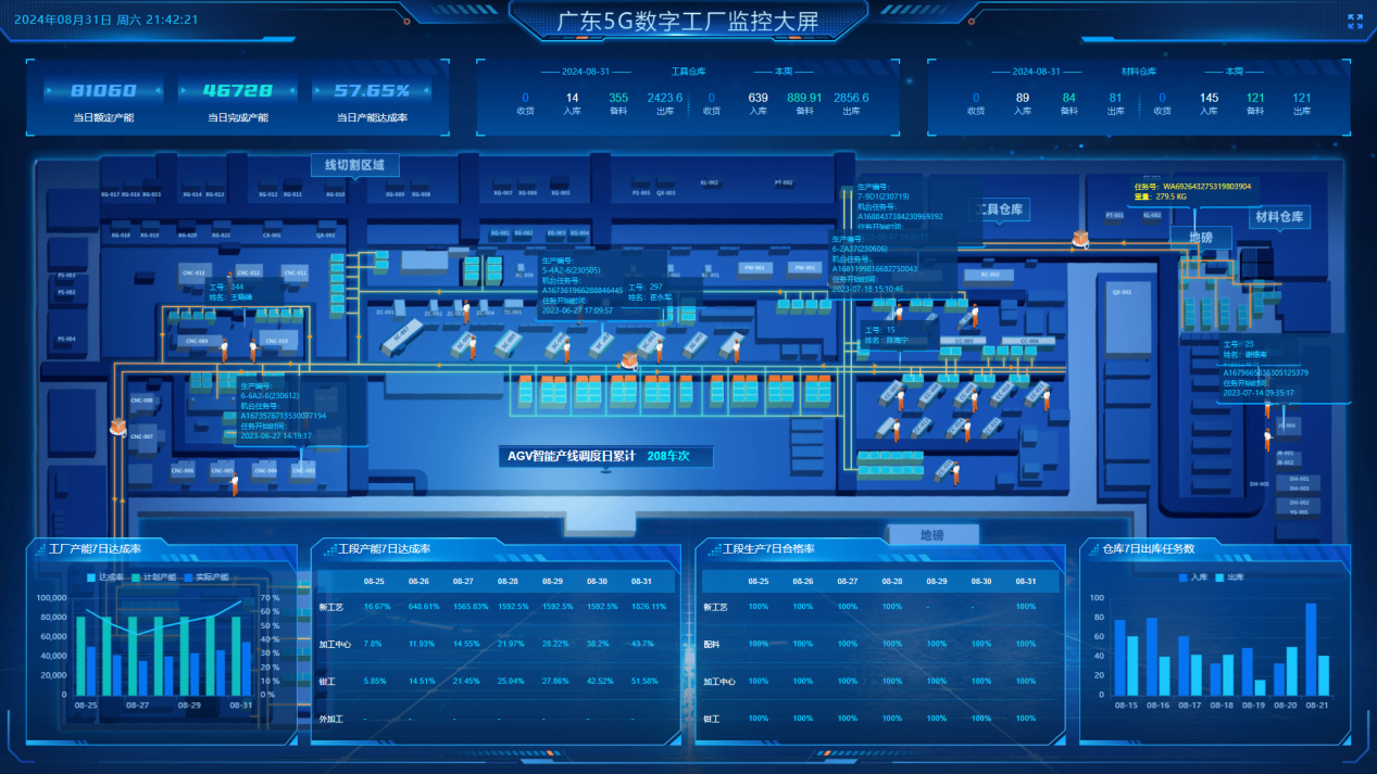 接收到生產(chǎn)訂單,根據(jù)設備5G聯(lián)機數(shù)據(jù)、訂單交期、各車間產(chǎn)能自動進行排產(chǎn),生產(chǎn)現(xiàn)場結合智造大腦提供數(shù)據(jù)進行智能派工協(xié)同生產(chǎn),智造大腦“滴滴派單”模式減少現(xiàn)場班組長90%+協(xié)同工作,提升了柔性制造效率、產(chǎn)能。