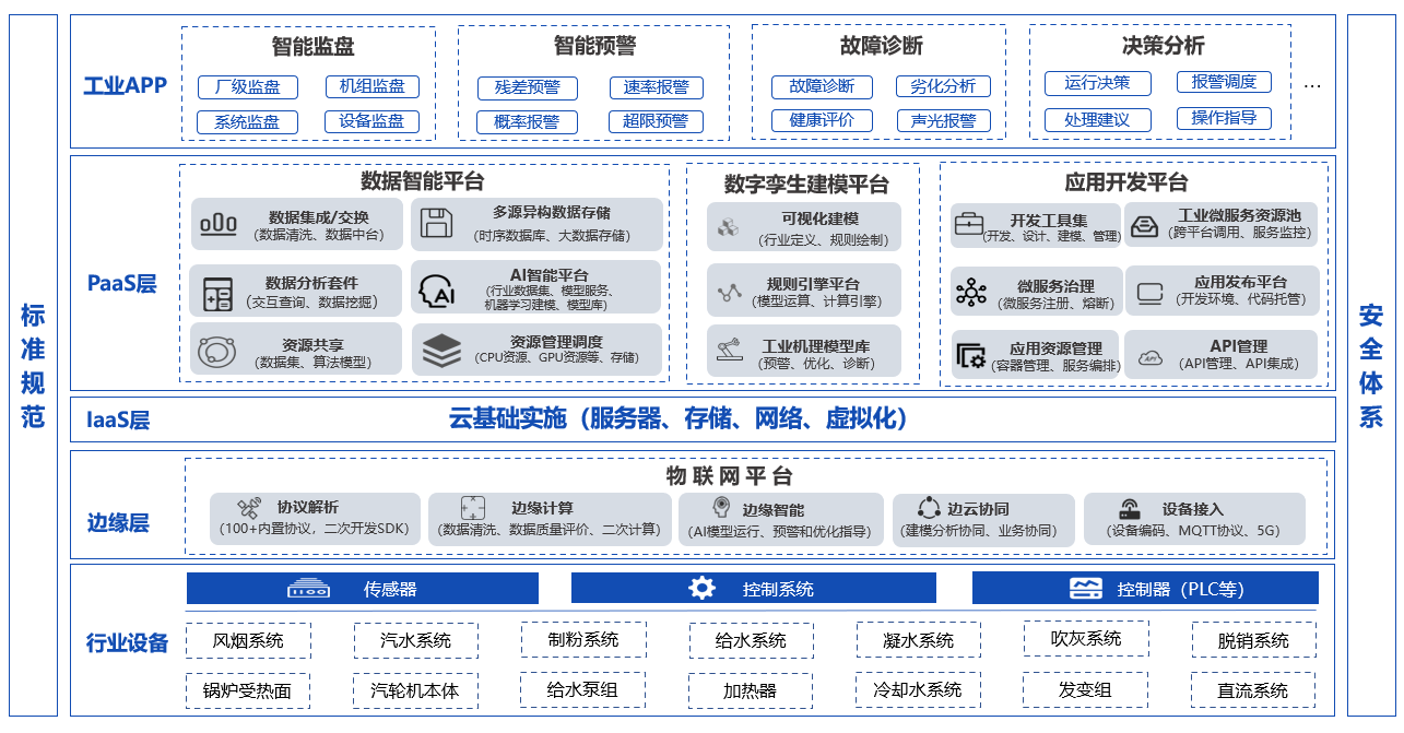 基于工業互聯網平臺的電廠智慧運行系統于2020年12月開始建設,朗坤智慧組建項目實施小組入駐國信揚電,國信揚電安排脫產的運行人員配合系統開發。雙方共同成立智慧運行系統開發中心,組建聯合開發小組,完成項目藍圖設計、制定項目實施細則、發布考核辦法、明確雙方工作職責,堅持周例會和月例會制度,及時解決項目實施中存在的問題,按計劃圓滿完成了關鍵技術研究和項目實施。項目主要建設內容包括: