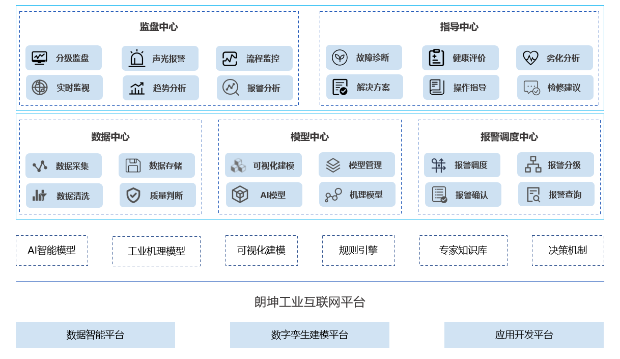 基于工業互聯網平臺,建立數據中心、模型中心、報警調度中心、監盤中心和指導中心,打造“一個平臺”、“五個中心”,實現監盤智能化。