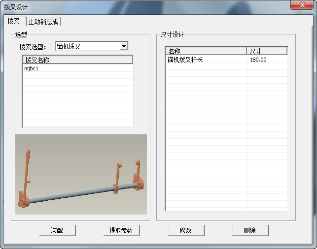 通過選型的可根據需要選擇自己需要的撥叉,在選型框下方為各大類細分的具體數據,在列表中選擇需要的規格;在選型對話框下面是相關截圖預覽;在尺寸設計框中,可修改相關參數,以變化模型。