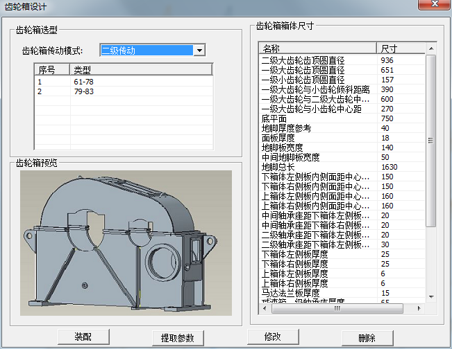 在選型界面可選擇需要的齒輪罩類型,類型可擴展。可通過“提取參數”功能,將當前模型中的數據提取到尺寸設計表中,可自定義相關尺寸,點擊“修改”可將當前值傳遞到模型。