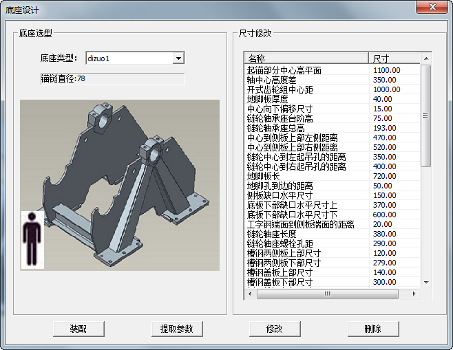 在“底座類型”中,可通過下拉菜單選擇需要的底座模型,下方為圖片預覽。可通過此尺寸列表,修改模型中的相關尺寸信息,具體操作方式為:點擊“提取參數”在模型樹中選擇底座總成選擇完成后將會在此表中將模型中可調整的參數顯示出來修改尺寸信息在功能按鈕區域點擊“修改”,通過此流程將可以修改相關尺寸信息。
