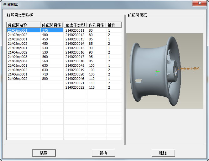 絞纜筒為族表形式,在左側對話框中選擇絞纜筒的結構,在右側對話框中選擇具體的規格,在右側對話框中可了解到當前具體的子類型中的內孔直徑以及鍵數等關鍵參數信息。