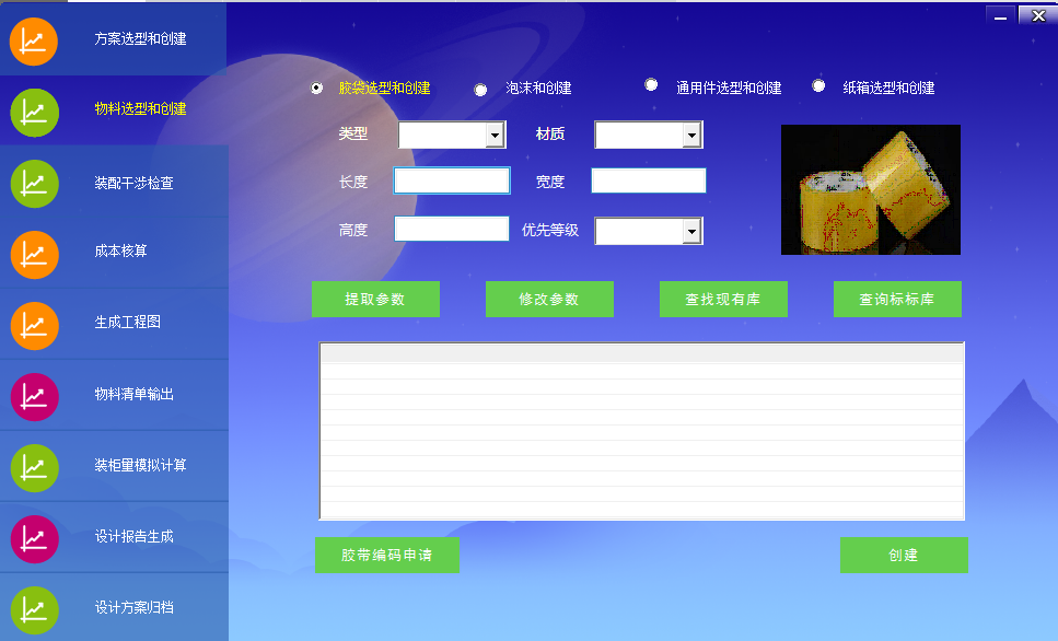 第二步:APP根據產品包裝方案自動進行詳細物料設計,工程師可以對物料尺寸進行修改,通過相似性識別技術,對物料中能夠借用已有物料的自動進行替換,無法借用的,工程師通過APP進行編碼申請,自動創建新的物料進行使用。