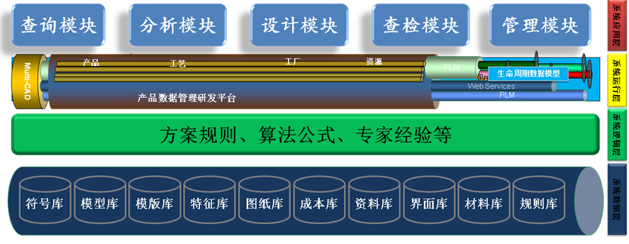 包裝智能設計APP主要包含選型、設計、檢查、分析、管理五大模塊,對應了產品設計的全流程,可以服務于整個產品的研發過程,系統架構如下圖所示: