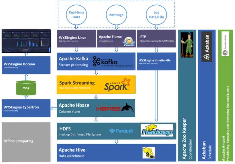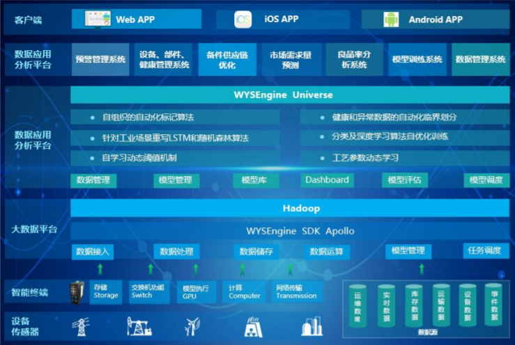 智能終端做為智擎工業(yè)設(shè)備數(shù)據(jù)采集運(yùn)算終端,可以與設(shè)備PLC 通信,把傳感器的實(shí)時數(shù)據(jù),錄波數(shù)據(jù)采集出來,并且作為端的運(yùn)算終端,針對實(shí)時的數(shù)據(jù)進(jìn)行初步的運(yùn)算,然后進(jìn)行大數(shù)據(jù)平臺的數(shù)據(jù)接入,可以支持?jǐn)?shù)據(jù)的斷點(diǎn)續(xù)傳。WYSEngine SDK Apollo 作為產(chǎn)品數(shù)據(jù)接口的 SDK 組件,運(yùn)行與 Hadoop 大數(shù)據(jù)平臺執(zhí)行,按照工業(yè)設(shè)備的數(shù)據(jù)應(yīng)用場景進(jìn)行功能組件的封裝,實(shí)現(xiàn)從數(shù)據(jù)的接入、數(shù)據(jù)處理、數(shù)據(jù)存儲、數(shù)據(jù)運(yùn)算、模型管理和任務(wù)調(diào)度等功能,為上層應(yīng)用提供平臺級的支撐。