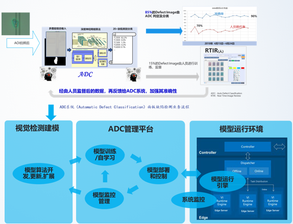為了解決以上的問(wèn)題和痛點(diǎn),格創(chuàng)東智在華星光電導(dǎo)入了一套基于格創(chuàng)AI應(yīng)用平臺(tái)的自動(dòng)缺陷分類(lèi)系統(tǒng),將人工智能算法與AOI設(shè)備結(jié)合,通過(guò)系統(tǒng)中的圖像識(shí)別算法以及深度學(xué)習(xí)算法,對(duì)各制程多種類(lèi)的缺陷圖片進(jìn)行學(xué)習(xí)訓(xùn)練及建模,開(kāi)發(fā)出具備自主學(xué)習(xí)能力的檢測(cè)模型,代替了大量人工,實(shí)現(xiàn)了無(wú)間斷、高精準(zhǔn)的缺陷自主檢查判定功能。該系統(tǒng)也與生產(chǎn)良率系統(tǒng)對(duì)接,實(shí)現(xiàn)了自動(dòng)判定、異常報(bào)警、自動(dòng)攔截等功能。在系統(tǒng)管理平臺(tái)中,廠(chǎng)商可以自主完成模型訓(xùn)練,模型部署和模型管理,方便后期針對(duì)新產(chǎn)品以及新缺陷進(jìn)行模型擴(kuò)展和自訓(xùn)。