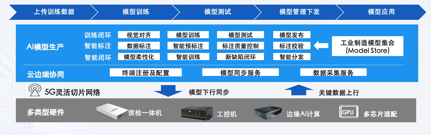 百度智能云提供全套的視覺解決方案,針對工業(yè)視覺需求推出百度工業(yè)視覺智能平臺,提供圖形化AI訓(xùn)練平臺,可以“0”代碼基礎(chǔ)的操作進(jìn)行模型自訓(xùn)練和優(yōu)化,包括視覺對齊、數(shù)據(jù)標(biāo)注、模型訓(xùn)練、模型評測、模型下發(fā)等功能。預(yù)測、模型訓(xùn)練采用端云一體模式,構(gòu)建了利用缺陷數(shù)據(jù)實(shí)現(xiàn)模型預(yù)測準(zhǔn)確率的不斷優(yōu)化升級的閉環(huán)。模型云端訓(xùn)練、模型快速下發(fā)至邊緣節(jié)點(diǎn)、模型通過邊緣計算進(jìn)行缺陷預(yù)測,邊緣節(jié)點(diǎn)采集的數(shù)據(jù)上傳到云端反哺模型訓(xùn)練迭代。