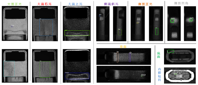自動化部分,設(shè)計部署了18個相機(jī)和光源,對零件外表面和內(nèi)腔實(shí)現(xiàn)流水線級別的圖像拍攝,在不同光源下對物體六個外表面及內(nèi)腔拍攝18張圖像,實(shí)現(xiàn)了360度圖像采集。