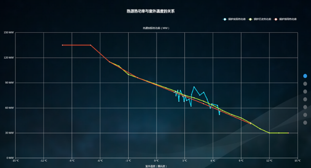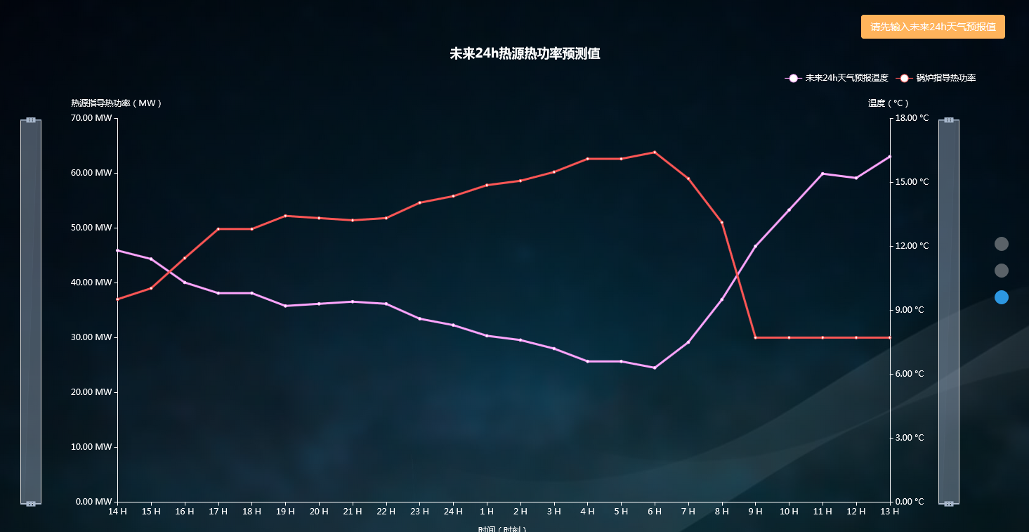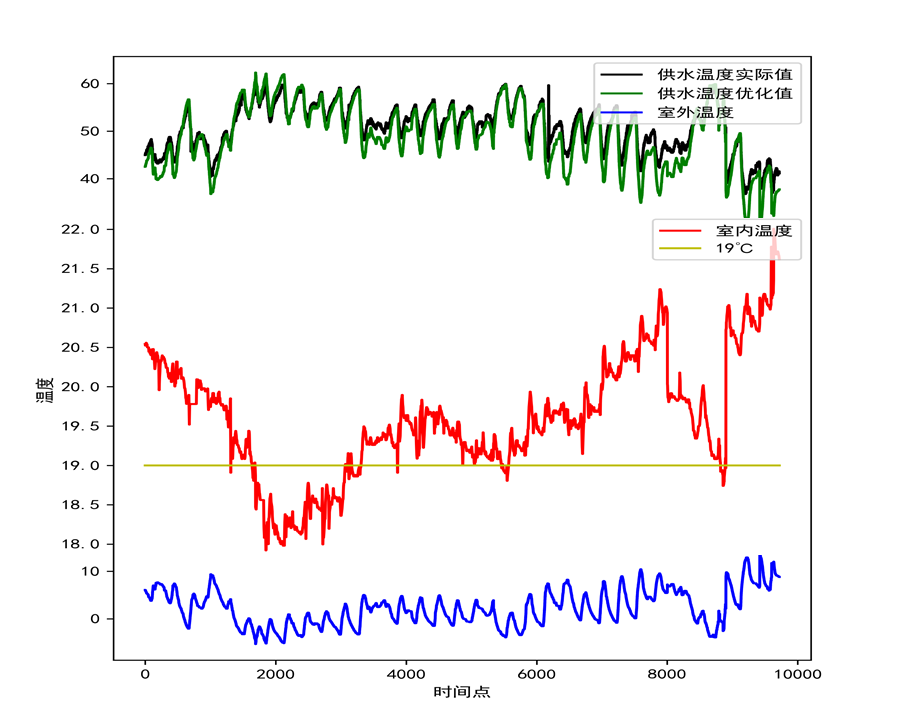 基于大量歷史數(shù)據(jù),得出一次網(wǎng)供熱溫度在不同工況下的純延遲與慣性時(shí)間。基于熱源機(jī)理與數(shù)據(jù)驅(qū)動(dòng),建立精確的熱源預(yù)測模型,通過該模型得出熱源在室外溫度改變時(shí),預(yù)測的熱源功率優(yōu)化曲線。進(jìn)而保證合理的供熱量,保證換熱站的熱量供給,如下圖所示。