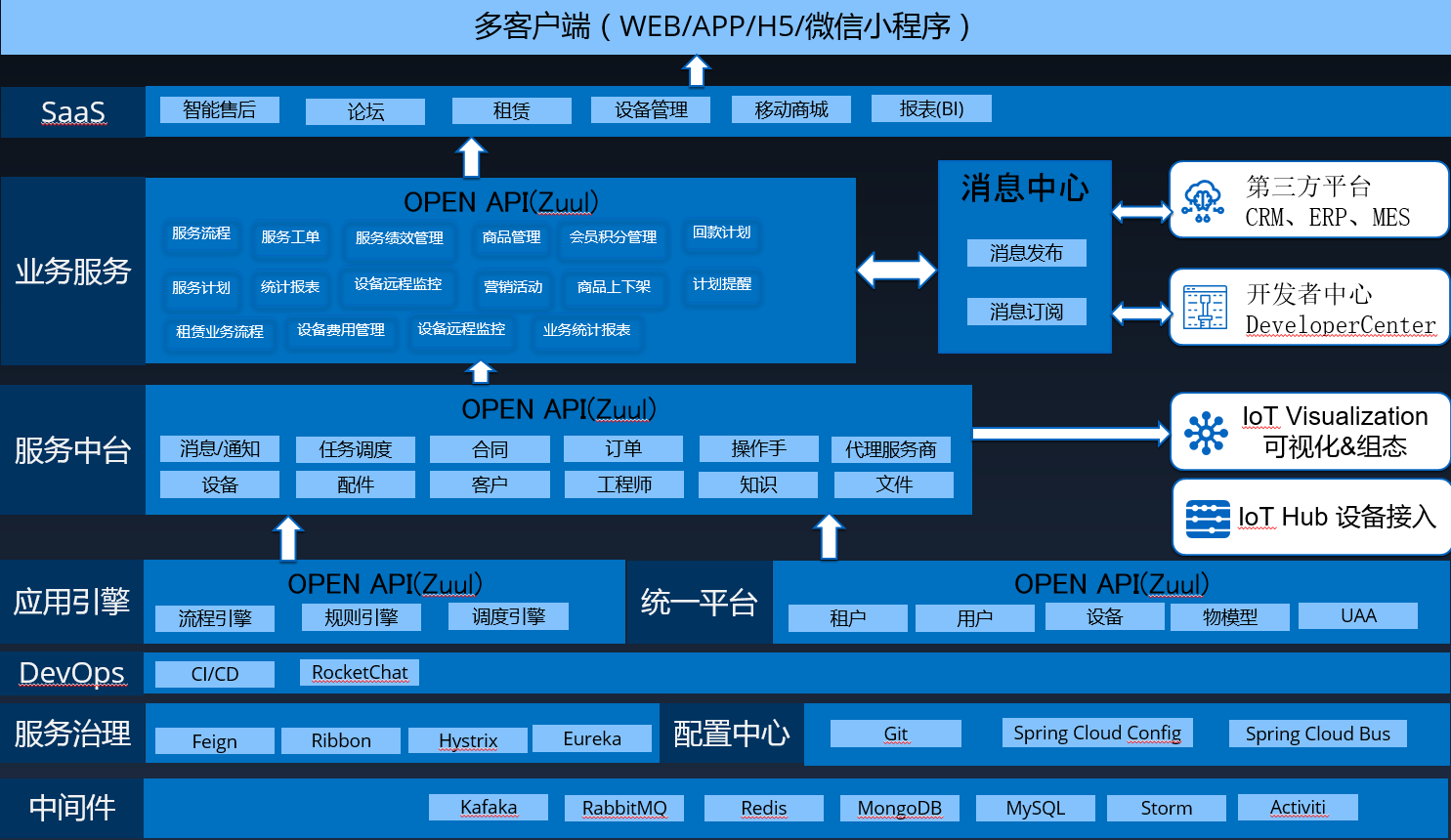 在平臺層:設(shè)備的數(shù)據(jù)傳送到平臺之后,對數(shù)據(jù)進(jìn)行整理,提取有用的信息,并將相關(guān)的數(shù)據(jù)規(guī)整到服務(wù)中臺上面,通過不同模塊的功能提供給應(yīng)用層來進(jìn)行調(diào)用,提高功能模塊的復(fù)用性。