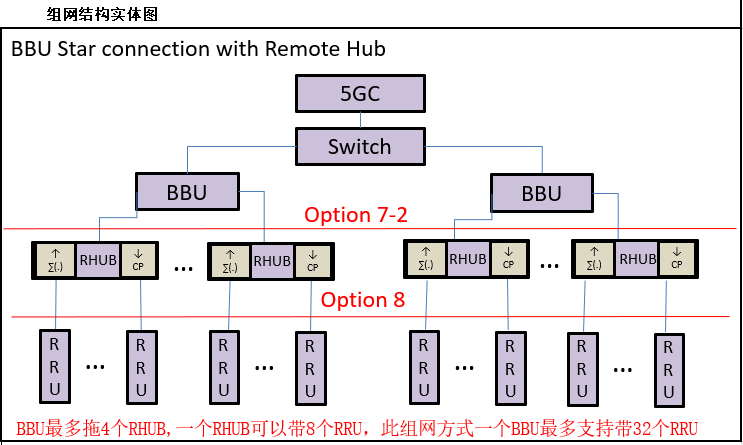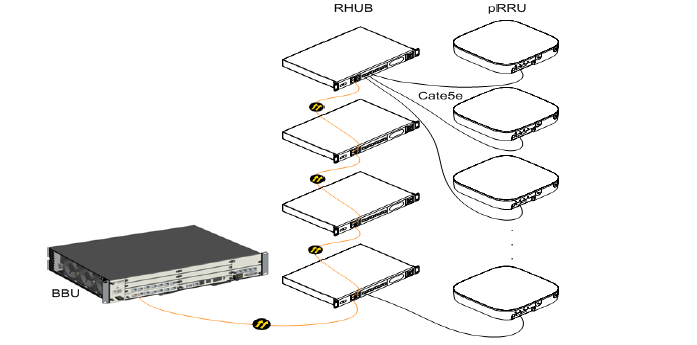 系統(tǒng)組網(wǎng)連接如上圖所示。RHUB使用光電復合纜連接遠端單元RRU,RRU含內置天線實現(xiàn)5G信號覆蓋。