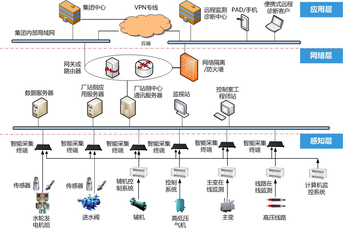 從信息技術(shù)角度分析,水力發(fā)電設(shè)備本身信息化程度較高,大多具備物聯(lián)網(wǎng)實現(xiàn)的基礎(chǔ)條件。尤其是對于大中型水電站而言,大多已經(jīng)建立了SCADA/計算機(jī)監(jiān)控系統(tǒng)、發(fā)電設(shè)備在線監(jiān)測系統(tǒng)、水情監(jiān)測系統(tǒng)、生產(chǎn)信息系統(tǒng)等,但存在的問題是,上述系統(tǒng)各自獨(dú)立,不能實現(xiàn)信息共享,更不能滿足機(jī)組安全預(yù)警、優(yōu)化運(yùn)行指導(dǎo)和檢修決策、維修指導(dǎo)的功能。因此,在大中型水電站實施工業(yè)互聯(lián)網(wǎng)的路徑,打通原來各個獨(dú)立的子系統(tǒng),就是要在電站或者流域性發(fā)電企業(yè)內(nèi)部建立一套完整的工業(yè)互聯(lián)網(wǎng)系統(tǒng),涵蓋機(jī)組的運(yùn)行控制、安全監(jiān)測、故障預(yù)警和診斷以及檢修、維修指導(dǎo)各生產(chǎn)環(huán)節(jié)。從信息安全的角度而言,水電行業(yè)有嚴(yán)格的網(wǎng)絡(luò)安全控制措施,能有力地保證設(shè)備安全、網(wǎng)絡(luò)安全、控制安全、應(yīng)用安全和數(shù)據(jù)安全。