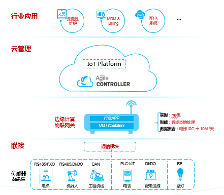 ? 敏捷控制器統(tǒng)一管理邊緣計(jì)算網(wǎng)關(guān),并對(duì)內(nèi)部VM和容器以及工業(yè)APP進(jìn)行端到端生命周期管理;
