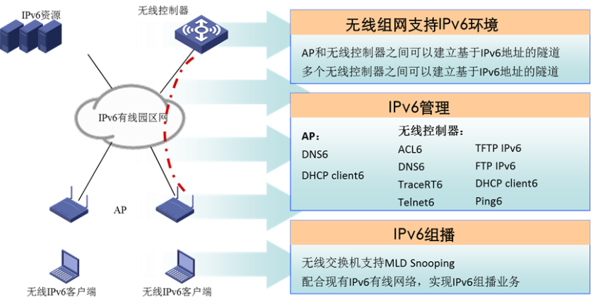 ? 支持ACL6、DNS6、Tracert6、Telnet6、TFTP IPv6、FTP IPv6、DHCP client6、Ping6實現(xiàn)IPv6有線無線網(wǎng)的同等管理。