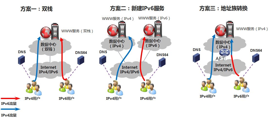 3)地址族轉(zhuǎn)換:在IPv4網(wǎng)站外部,掛接一臺v4/v6地址族轉(zhuǎn)換設備,原有IPv4源站不需修改,把DNS域名解析AAAA記錄指向轉(zhuǎn)換設備配置的IPv6 地址;IPv6用戶訪問目標網(wǎng)站,經(jīng)DNS解析調(diào)度后轉(zhuǎn)向訪問轉(zhuǎn)換設備的IPv6 地址,轉(zhuǎn)換設備從IPv4 源站讀取數(shù)據(jù),經(jīng)過協(xié)議轉(zhuǎn)換后發(fā)送數(shù)據(jù)給IPv6用戶。
