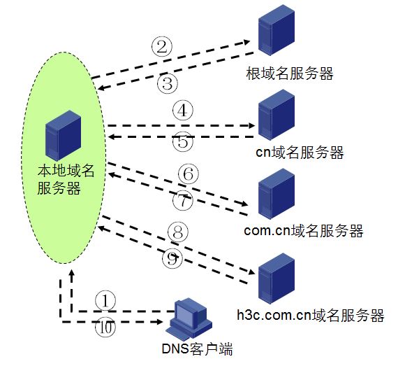 2)本地域名服務器接收主機客戶端DNS解析請求,從本地數(shù)據(jù)庫查詢域名對應的IP地址。如果從本地數(shù)據(jù)庫中查詢到對應的IP地址,則將查詢結(jié)果返回給主機客戶端;如果無法從本地數(shù)據(jù)庫查詢到對應結(jié)果,則本地服務器必須查詢其他的DNS服務器(類似于根服務器,二級、三級域名服務器),直到得到確認的查詢結(jié)果返回主機客戶端。