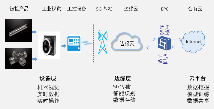 通過(guò)工業(yè)機(jī)器視覺(jué)實(shí)現(xiàn)產(chǎn)品質(zhì)量的圖像實(shí)時(shí)檢測(cè),并將實(shí)時(shí)圖像數(shù)據(jù)傳輸至邊緣層進(jìn)行智能分析決策,同時(shí)根據(jù)反饋結(jié)果實(shí)時(shí)操作。
