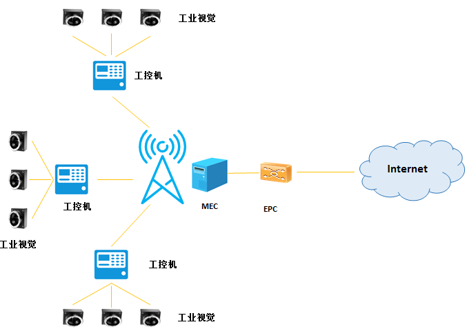本方案為兩級(jí)星型拓?fù)浣Y(jié)構(gòu)(如下圖所示),第一級(jí)為工業(yè)視覺(jué)設(shè)備和工控機(jī)之間的星型組網(wǎng),第二級(jí)為工控機(jī)和蜂窩基站間的星型組網(wǎng)。首先,多個(gè)工業(yè)視覺(jué)設(shè)備和一個(gè)工控機(jī)通過(guò)工業(yè)總線(xiàn)形成星型組網(wǎng),完成工業(yè)產(chǎn)品圖像數(shù)據(jù)的傳輸和工業(yè)殘次品的剔除控制;其次,工控機(jī)和蜂窩基站形成星型組網(wǎng),完成基于模型的圖像實(shí)時(shí)決策判斷和數(shù)據(jù)的傳輸。
