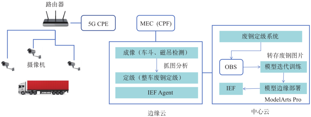邊緣云部署AI推理應(yīng)用,中心云用于模型訓(xùn)練。中心云和邊緣云之間通過智能邊緣平臺(Intelligent EdgeFabric,IEF)解決方案(見圖2)實現(xiàn)邊云協(xié)同。