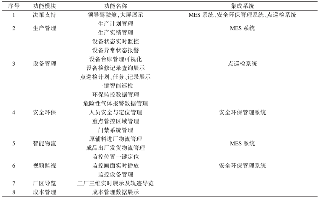 工廠數(shù)據(jù)平臺主要集成三方面數(shù)據(jù),即基礎(chǔ)數(shù)據(jù)、生產(chǎn)運行數(shù)據(jù)和管理數(shù)據(jù)。在集成數(shù)據(jù)平臺的基礎(chǔ)上,開發(fā)了生產(chǎn)工藝、設(shè)備與點巡檢、安全環(huán)保、智能物流、視頻監(jiān)控、廠區(qū)導(dǎo)覽、成本管理等八大功能模塊,具體功能如表1所示。