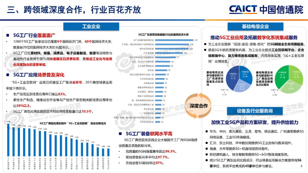 報告分析,1260個5G工廠名錄項目已覆蓋全國28個省(自治區、直轄市)、9個國民經濟門類、60個國民經濟大類。同時5G工廠作為推進工業和信息化深度融合的重要舉措,原材料工業、裝備工業、消費品工業、電子信息、能源交通等行業企業與基礎電信企業、設備及行業服務商深度合作,形成100個5G工廠典型應用實踐,各工廠平均5G網絡覆蓋率高達99.3%、現場裝備聯網率高達97.7%、無線設備5G聯網率達97%,“5G+工業互聯網”應用場景建設數量達10.5個,5G在工廠內由“單點”應用向全環節、全流程、全周期、全局、自主協同等“綜合”應用發展。一是加速企業全環節柔性生產。5G工廠推動工廠網絡無線化,通過5G全廠覆蓋,探索實現生產現場裝備云化群體控制、產線模塊化快速重構、供應鏈實時動態協同等,從而支撐企業依據市場需求,實現全環節快速調整的柔性生產方式。二是5G+數字孿生實現生產全流程精益管控。通過5G工廠系統性實施, “5G+數字孿生”已從產品研發設計、企業生產運營的可視化應用,擴展到安全生產閉環管控、廠區物流實時優化、關鍵部件精準運維等應用,實現了“虛實映射、實時監控”的工廠生產全流程精益管理。三是5G+大數據賦能企業全生命周期能碳精準管理。企業通過5G工廠建設,充分利用5G實現全廠區、全流程能源消耗與關鍵排放源數據的實時采集,構建包含碳排放監測、碳足跡核算、全鏈條碳管理等功能的能效管理體系,形成基于數據驅動的能碳精準管控模式。四是5G+AI助力實現生產全局智能發展。在5G工廠智能化服務應用要求的牽引下,工廠充分利用5G實時采集匯聚全廠及供應商相關數據,推動人工智能應用從單點輔助工具,深入到產品研發、產線生產、系統運維、企業管理等全局,形成生產供應鏈智能全局調度,產品運維智能服務等新模式。五是5G+AI融合形成多機自主協同操控。隨著5G工廠建設質量的不斷提升,5G高可靠、低時延性能不斷增強,人工智能技術的應用開發,設備遠程操控將從早期依賴人工判斷和操作的單點遠程操控,向由數據驅動的多設備自感知、自適應、自決策的智能化無人自主協同操控演進。