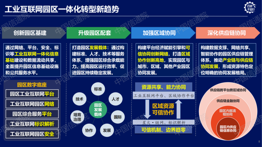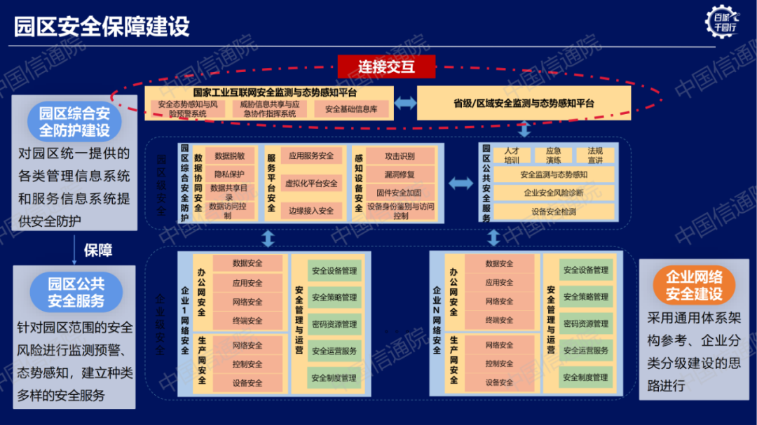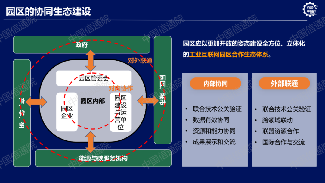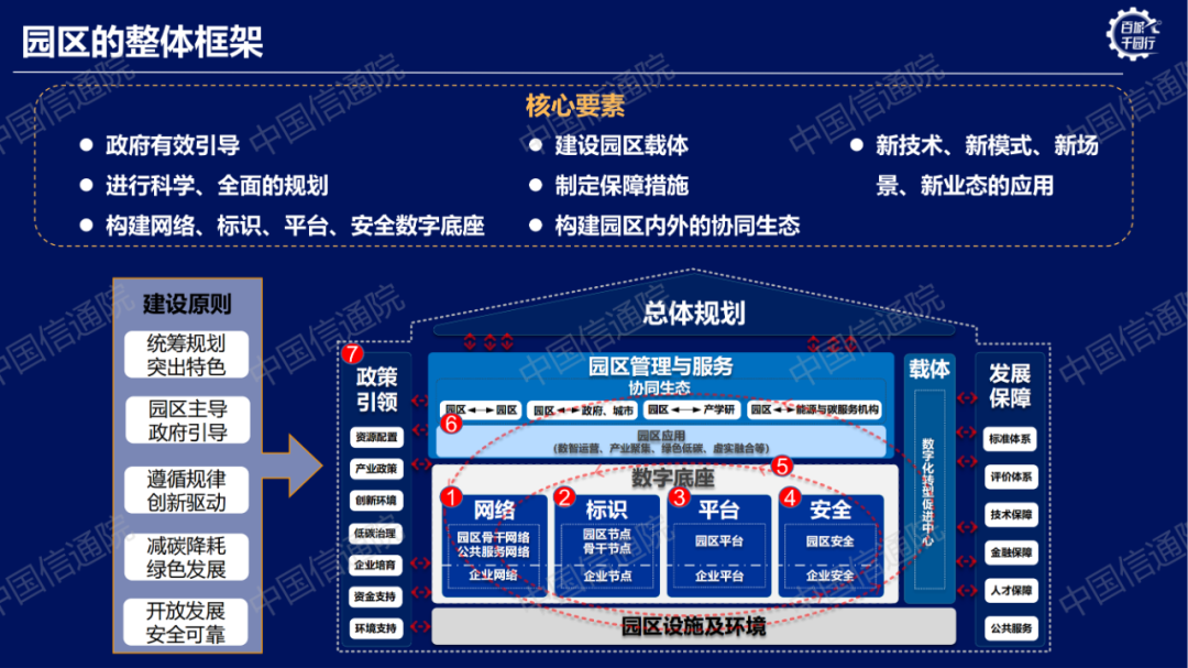 4. 工業互聯網園區整體框架:工業互聯網園區的建設與發展,應在國家和各級地方政府政策措施的引領下,以科學規劃為指導,通過打造網絡、標識、平臺、安全等園區數字底座,構建園區內部與外部的數據流動閉環,形成各產業角色之間的協同有機生態。建設數字化轉型促進中心等載體,以標準、評價、金融等體系為保障,通過新技術、新模式、新場景、新業態的應用,形成園區的健康、低碳、良性、區域一體化發展的新發展模式,建立園區發展特色和發展優勢。
