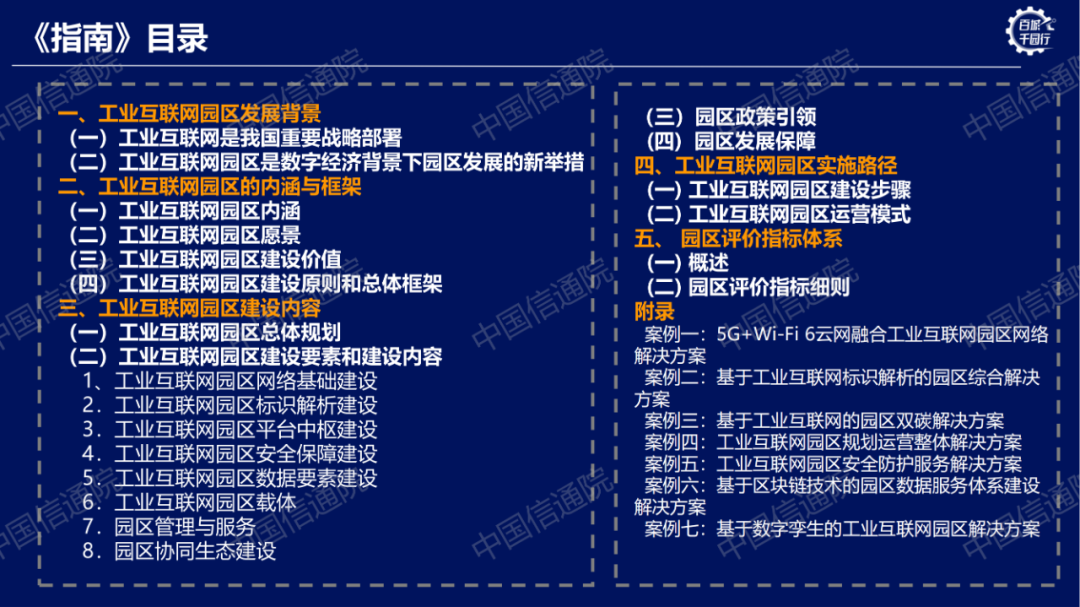 中國信通院總工程師敖立對指南(2.0版本)進行了詳細解讀。他指出指南(2.0版本)整體包括發展背景、內涵框架、建設內容、實施路徑和評價指標五個部分。圍繞數字經濟、綠色低碳、中小企業特色產業集群等最新相關政策,更新了工業互聯網園區的最新發展背景、內涵與框架,細化了標識、數據等園區建設內容,增加了線上線下一體化的園區新運營模式總結,并相應的對評價指標體系進行了優化調整。同時,結合工業互聯網園區近幾年的發展態勢,節選部分優秀案例,以饗讀者。