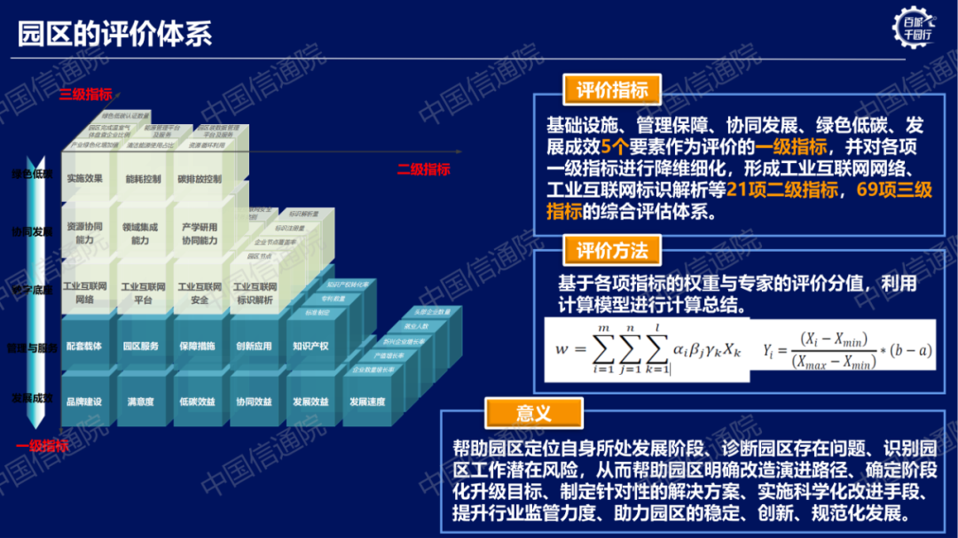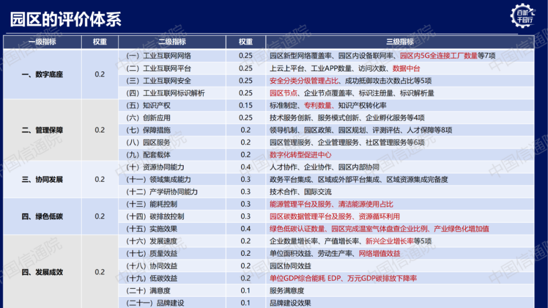 5. 工業互聯網園區評價指標體系通過科學的方法,分別從數字底座、管理與服務、協同發展、綠色低碳、發展成效5個要素作為評價的一級指標,并對各項一級指標進行細化,形成工業互聯網網絡、工業互聯網標識解析等21項二級指標,69項三級指標的綜合評估體系。