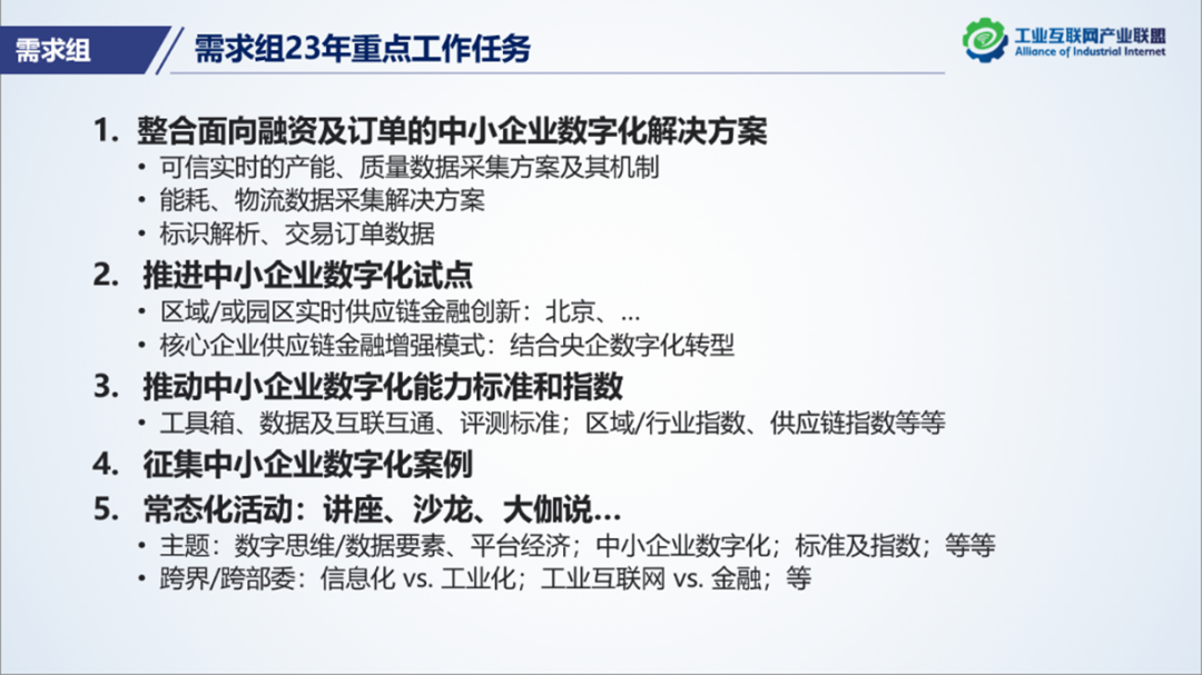 中小企業(yè)融資難題歷來備受社會關(guān)注。2022年,需求組組織工業(yè)互聯(lián)網(wǎng)界和金融界跨界攻關(guān),以“中小企業(yè)實(shí)時生產(chǎn)行為數(shù)據(jù)”為突破口,發(fā)布《面向融資和訂單場景的中小企業(yè)基礎(chǔ)數(shù)字化能力指南》。本次會議圍繞中小企業(yè)可信實(shí)時的內(nèi)部產(chǎn)能/質(zhì)量數(shù)據(jù)的采集、外部物流數(shù)據(jù)、數(shù)據(jù)量化表征、風(fēng)控等主題,專家們從不同視角,并就后期中小企業(yè)數(shù)字化能力標(biāo)準(zhǔn)、試點(diǎn)工作等,進(jìn)行了熱烈討論。浙江藍(lán)卓負(fù)責(zé)的中小企業(yè)案例庫目前已征集30余項(xiàng)案例,未來將篩選優(yōu)質(zhì)案例匯編成冊。重慶創(chuàng)新中心的企業(yè)數(shù)據(jù)工程、博山綠色數(shù)字經(jīng)濟(jì)研究院的專業(yè)質(zhì)檢機(jī)構(gòu)轉(zhuǎn)型云服務(wù)和創(chuàng)新質(zhì)量檢測機(jī)制的案例引起熱議。最后達(dá)成聯(lián)合推進(jìn)試點(diǎn)、制訂標(biāo)準(zhǔn)和構(gòu)建指數(shù)等工作的共識和意向,下一步需求組將繼續(xù)聯(lián)合總體組推進(jìn)。