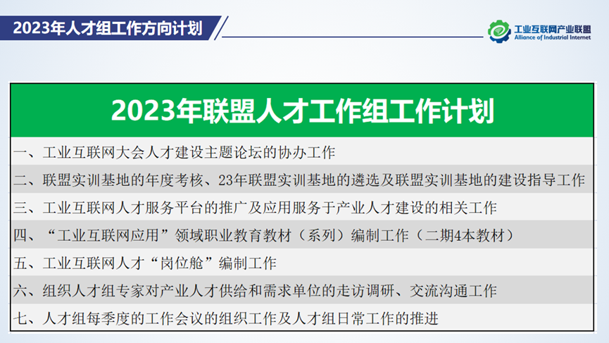 人才組接下來的工作將從工業(yè)互聯(lián)網(wǎng)人才服務(wù)綜合平臺建設(shè)、工業(yè)互聯(lián)網(wǎng)人才“崗位艙”標(biāo)準(zhǔn)指導(dǎo)類文件的編制、工業(yè)互聯(lián)網(wǎng)產(chǎn)教融合人才實(shí)訓(xùn)培育等方向繼續(xù)推進(jìn),加快人才梯隊(duì)建設(shè)。