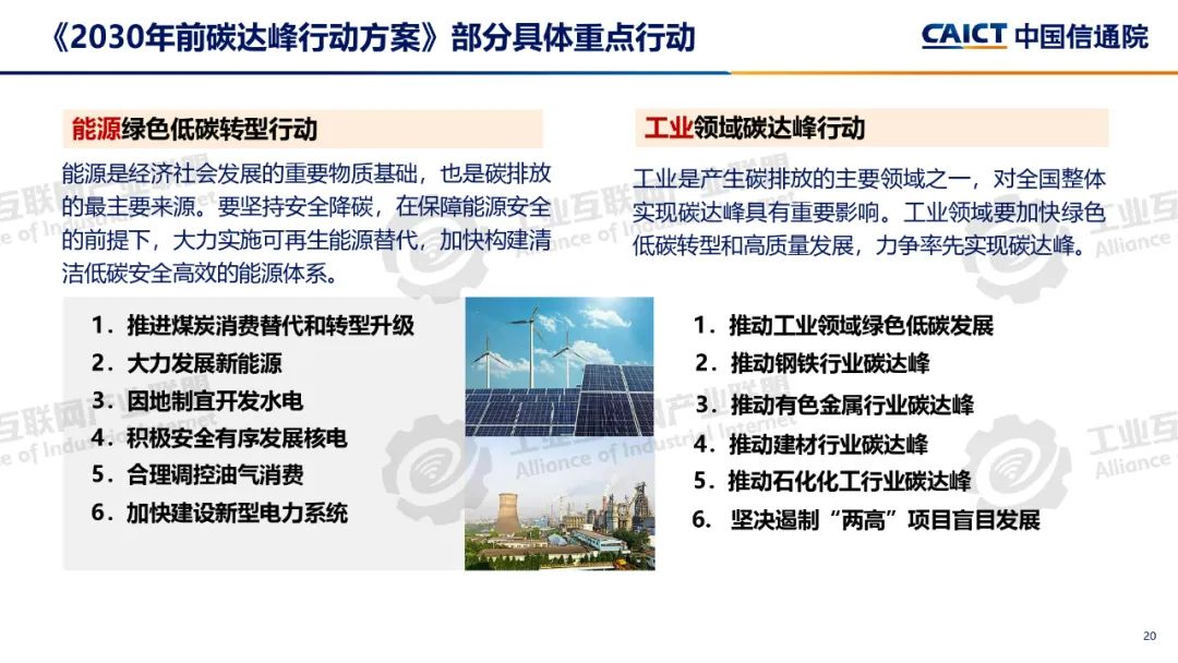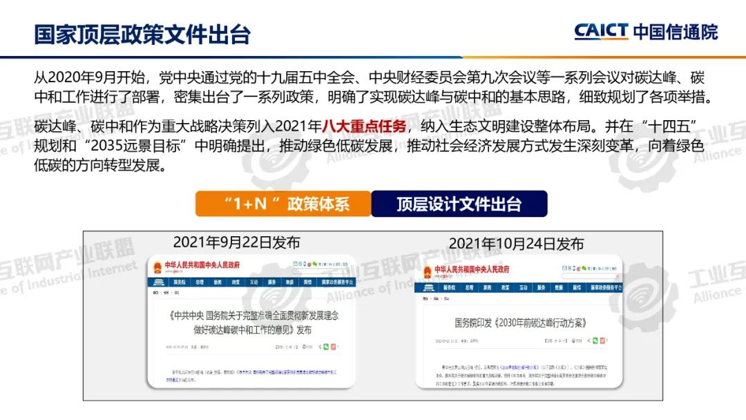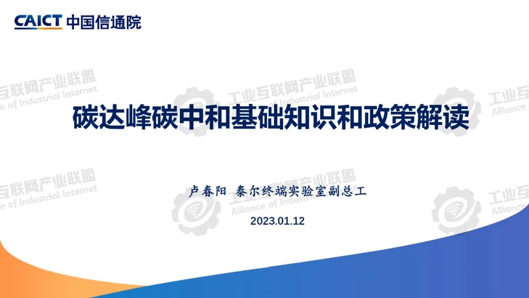 本期為您介紹由中國信息通信研究院泰爾終端實驗室副總工盧春陽分享的《碳達峰碳中和基礎知識和政策解讀》。盧春陽講解了碳達峰碳中和的科學內涵、經濟內涵和重要意義,分析了國內外能源消費結構和我國碳排放的現狀,以及碳達峰碳中和面臨的挑戰,解讀了我國碳達峰碳中和“1+N”政策體系,重點講解了《2030年前碳達峰行動方案》具體重點行動以及工業、建材和有色行業碳達峰實施方案的主要內容。