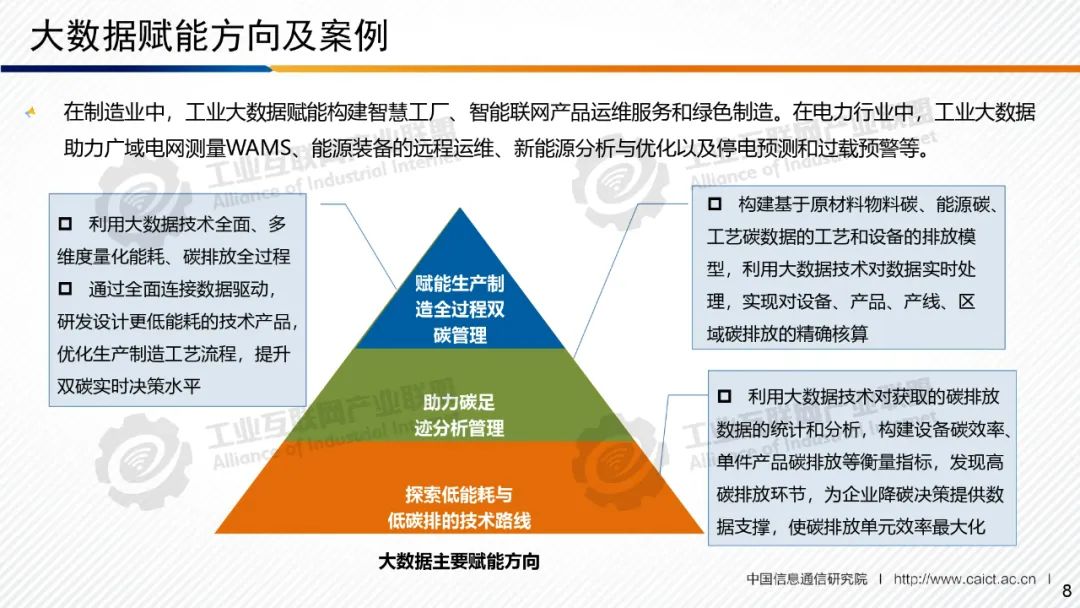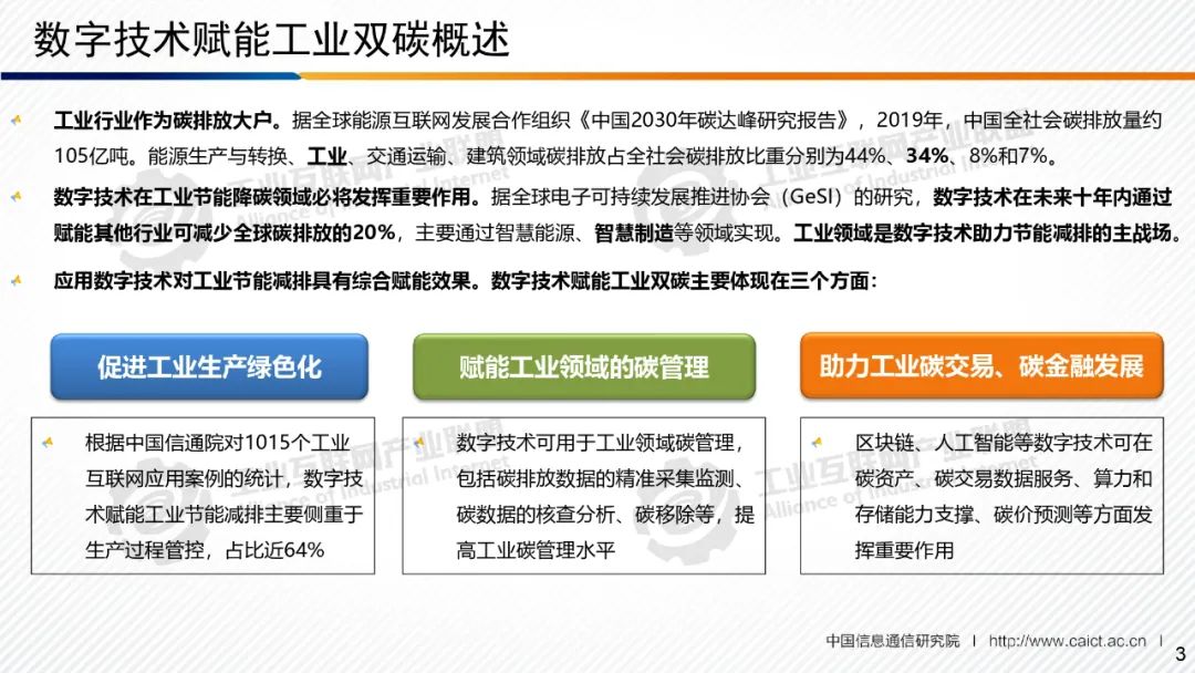 本期為您帶來由中國信息通信研究院產業與規劃研究所副總工賈敬宇分享的《數字技術賦能工業碳達峰碳中和概述》。數字技術在工業節能降碳方面正發揮著不可或缺的重要作用:一是促進工業生產綠色化,為工業領域生產流通過程中的節能改造、節約用料、供需精準對接等提供有力支撐;二是賦能工業領域的碳管理,服務工業領域碳排放數據的精準采集監測、碳數據的核查分析、碳移除等;三是助力工業碳交易碳金融發展,支撐碳資產、碳交易數據服務、算力和存儲、碳價預測等。同時,各類數字技術相互融合、共同發力,在賦能工業節能降碳方面發揮綜合效應,實現倍增效果。