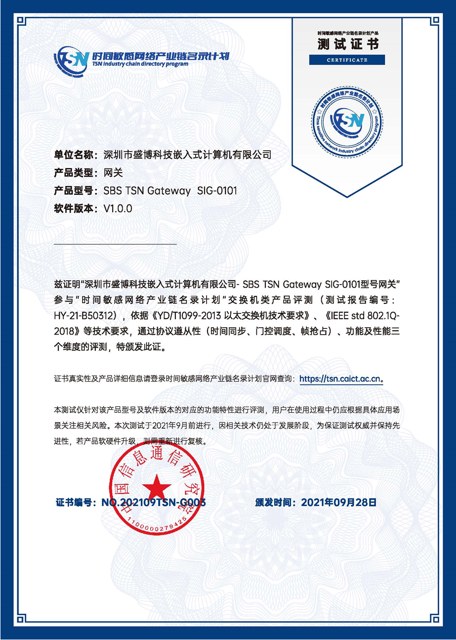 2021年9月,深圳市盛博科技嵌入式計算機有限公司研發的SIG-0101網關在互聯網與工業融合創新工信部重點實驗室順利通過“TSN產業鏈名錄計劃”產品測試,獲得網關類測試證書,成為第一批加入產業鏈名錄計劃的產品。