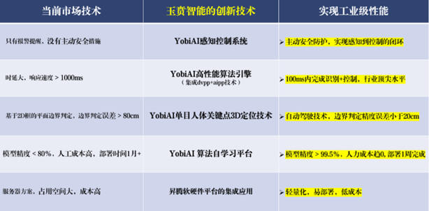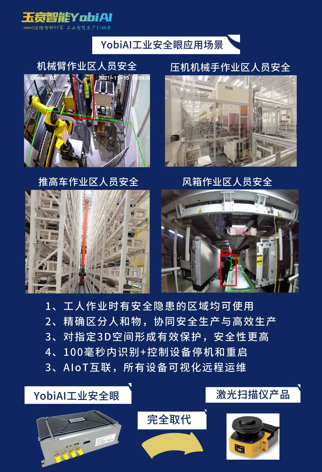 YobiAI工業安全眼功能與部署方式相較于傳統的掃描儀,YobiAI工業安全眼具有明顯優勢。激光掃描儀只能檢測一個平面的范圍,在同一區域需要部署多臺設備以實現全方位監測。而 YobiAI 產品采用視頻監控,一套即可完成對整個區域的監控。此外,激光掃描儀難以區分人和物,誤判可能會導致生產中斷,而YobiAI 工業安全眼則能精準識別,且僅在確有人員進入危險區域時才會中斷生產,為企業生產效率、生產安全保駕護航。
