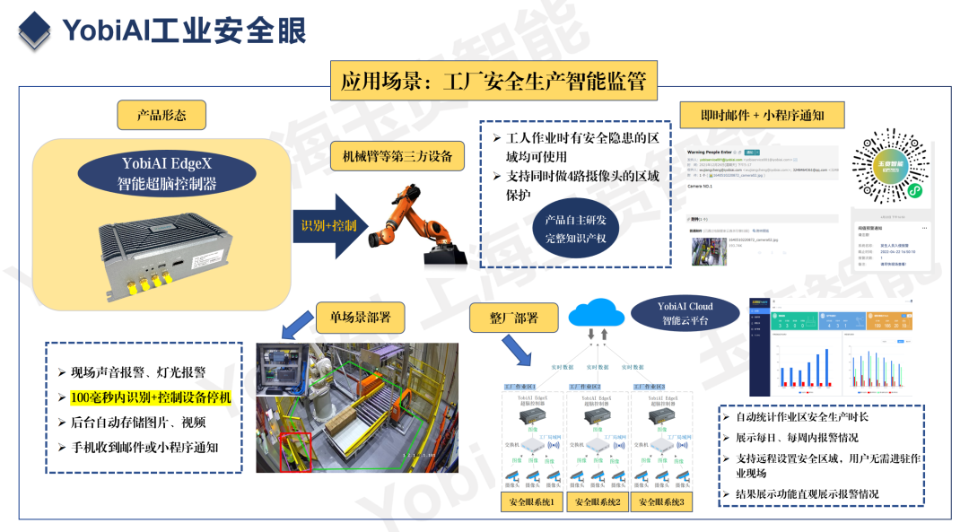 該工廠實際生產區域占地300平方米,現場共部署了2套YobiAI工業安全眼。每套系統均由一臺YobiAI EdgeX智能超腦控制器和3路攝像頭組成。當有人員進入監測范圍時,工業安全眼會及時檢測到并立即停止機械臂的工作。此外,現場拍攝到的圖片還將通過郵件和小程序等方式發送給管理人員,讓其能夠更好地進行工廠的安全管理。