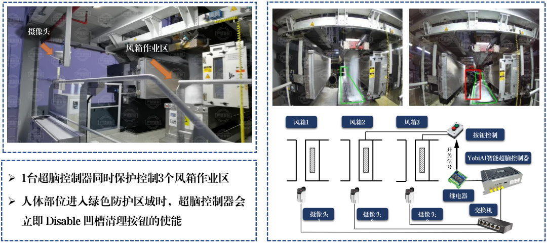 本方案使用了YobiAI工業安全眼對風箱作業區做智能化安全管理,一旦有人員在受保護區域內工作,區域外的人按動按鈕,切刀也不會工作。因而能有效地保護工人們的安全。